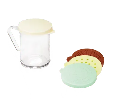 Stay competitive and innovative with the TableCraft Products, 166F Shaker/Dredge Set. This set is designed to meet the needs of commercial restaurants, ensuring efficiency and convenience in the kitchen. Each set includes 12 units, making it easy to stock up and meet high demand. The shaker/dredge set features a 10 oz. capacity, perfect for seasoning dishes with precision. The poly construction with a handle ensures durability and ease of use, while the snap-tight plastic lids in beige, rose, and yellow provide a secure seal to prevent spills and maintain freshness. Dishwasher safe and made in the USA, this set is not only practical but also meets high-quality standards. Plus, it is BPA-free, ensuring the safety of your customers. Enhance your restaurant's operations with the TableCraft Products, 166F Shaker/Dredge Set.
